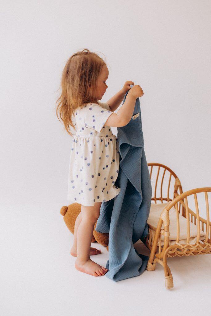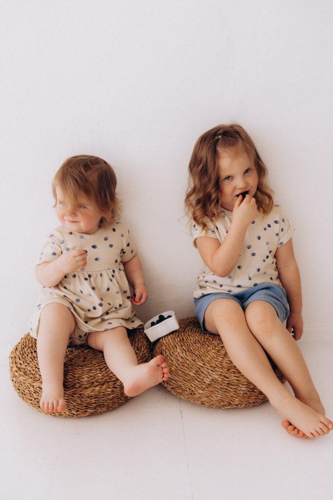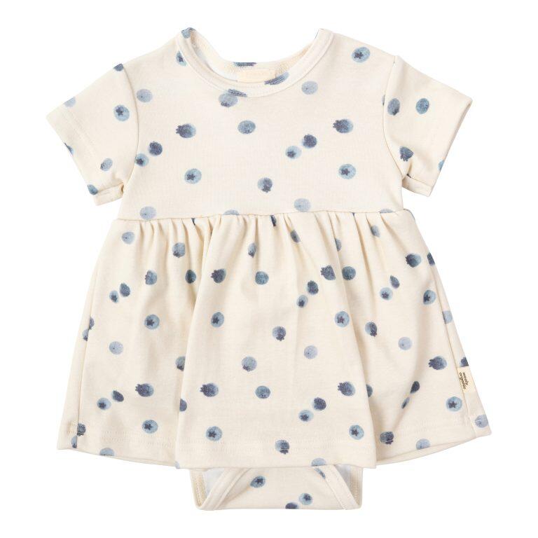 La stampa Blueberry Breeze aggiunge un tocco vivace e rinfrescante, con piccoli mirtilli e tonalità morbide che richiamano l’estate e la natura. Il body integrato mantiene il vestito sempre in posizione, anche durante i movimenti più attivi, evitando continui aggiustamenti. Facile da indossare e togliere, è una scelta pratica e funzionale per i genitori, perfetta sia per il gioco che per i momenti di relax.