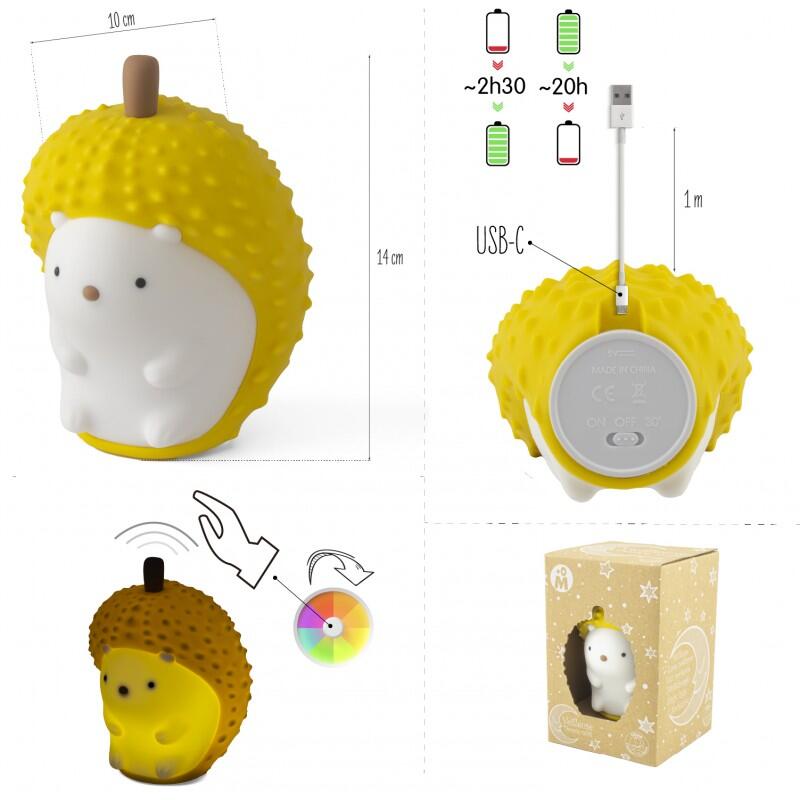 La lucina a forma di riccio firmata Ulysse Couleurs d’Enfance è un piccolo tesoro di dolcezza e funzionalità. Realizzata in silicone morbido, lavabile e privo di sostanze nocive, è pensata per accompagnare i sogni dei più piccoli con sicurezza e poesia.