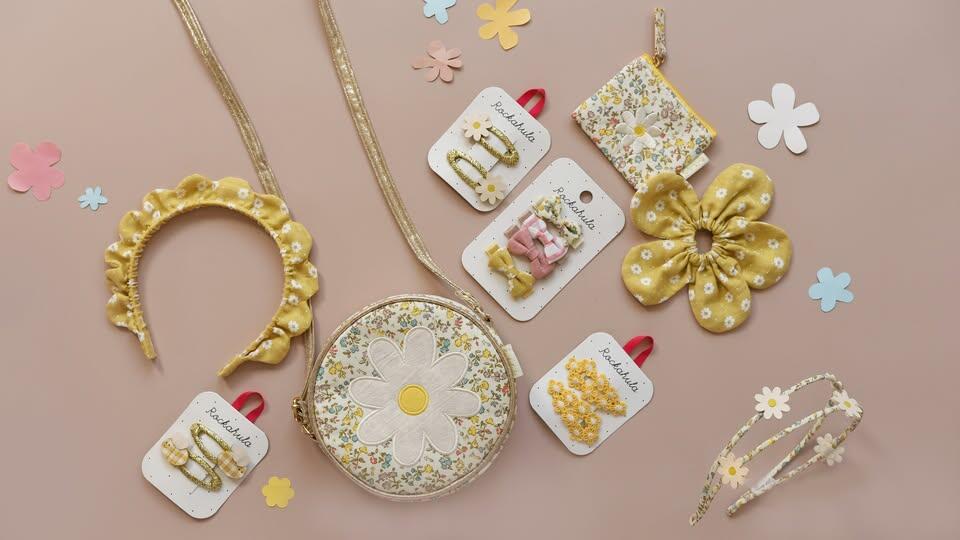 Un set di quattro mini bow clips in una palette vivace e divertente, realizzate con i tessuti iconici Rockahula: Heidi floral, righe rosa, buttercup floreale e gingham corallo. Clip rivestite in gros-grain.